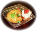 We offer plant based clamshells made from corn starch PLA resin.  They are perfect solution for “take-out” food.  They are